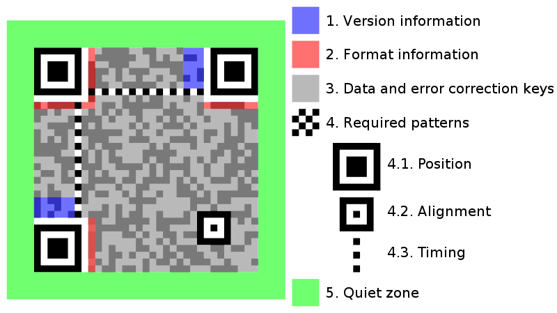 The QR code consists of a rigid square matrix. This matrix consists of black and white dots representing the encoded binary data. Special markings in three of the four corners of the square serve as guidelines. The data in the QR code is protected by an error correcting code. This tolerates the loss of up to 30% of the code, by taking this measure the QR code can be decoded.